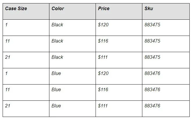 The solution ended up being simpler than we initially thought. By creating a new Variant Group – in our example for “Case Quantity” – we created variants for the case sizes, and then where applicable, for color or size. So, for example, we have variants that look like this: